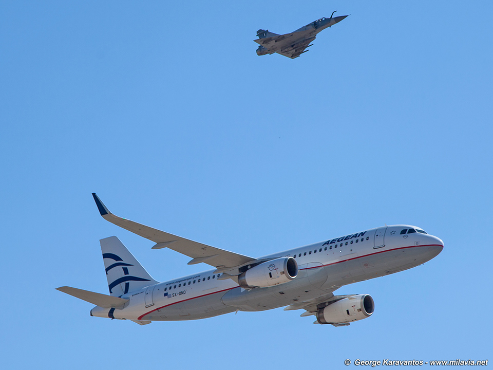 HAF Mirage 2000 EGM '237' with Aegean Airlines A320-232. Photo copyright George Karavantos