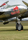 Personal highlight for me was the P-38L-5 Lightning. This "silver bullet" was put through its paces using every inch of the Duxford sky with her whopping 1600 Hp per engine. This P-38 came out of the factory in April 1946 in Chicago. Despite not having seen any WOII action, it became very famous, especially in the United States, on another level. She was used as an air racer during the Reno Air Races from 1977 till 2001 in the capable hands of Lefty Gardner, one of the co-founders of the CAF (Commemorative Air Force) in Texas. The striking appearance in white, with red and blue lines, made her famous as "White Lightning". She probably still would have flown in the United States if it weren't for that unfortunate day in 2001 when, while returning to her home base in Texas, the LH engine caught fire and the pilot was forced to crash-land her in a nearby field. From then on efforts to get her back into the air were in vain, until Red Bull made an offer in 2005, as they loved to add another remarkable aircraft to their already impressive collection. Since then she had undergone restoration work and maintenance at Ezell Aviation till 2009, with the P-38 being shipped to Salzburg in Austria. Making her first ever appearance in the United Kingdom and at Flying legends this year.