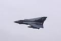 After a few manoeuvres in steadily deteriorating visibility the Typhoon departed the area for a radar talkdown and landing as later repeated by the Royal Netherlands Air Force F-16 display and by two Tornado GR.4 operating as singletons performing simulated attack runs with pyrotechnics as their part of the Role Demo sequence of which the only other aircraft to fly was the E-3D Sentry which flew up from Waddington to perform an overshoot, appearing in its own condensation cloud out of the murk only as it crossed the airfield boundary. The Red Arrows, performed a restricted version of their ‘flat display’ which required rather longer than usual run-ins, often with the outermost members of the team skirting the cloud base while solo display Tutor, Tucano and Hawk performed similarly reduced displays and the Royal Navy ‘Black Cats’ and Army ‘Blue Eagles’ flew single aircraft. Having been delayed by weather conditions en-route on the Friday local conditions on Saturday kept the Battle of Britain Memorial Flight away but a privately owned Spitfire Mk.XVIII did fly. The advertised appearance of Vulcan B.2 XH558 drew a large crowd which held on until late in the afternoon hoping to see it fly as the penultimate display and while it rather ironically sat at the end of the runway in the only sunshine of the day visibility elsewhere on and around the airfield meant that it, like several other non-military participants, could only perform fast ground runs. Finally the only locally based Tornado F.3 involved in the event, two others had been planned for the Role Demo, performed a high speed flypast for the closing sunset ceremony before being swallowed by the again rapidly lowering cloud base.