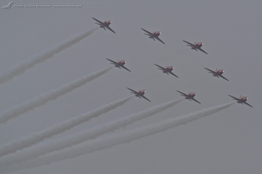 Skirting the low cloud base the Royal Air Force Aerobatic Team - The Red Arrows passes in impecable formation.