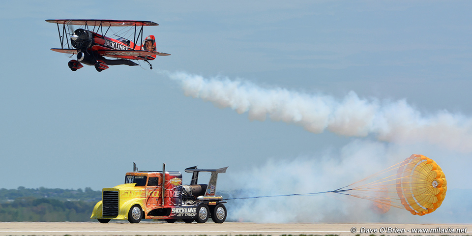 Sasquatch Jet Biplane racing Shockwave Jet Truck. Photo copyright Dave O'Brien