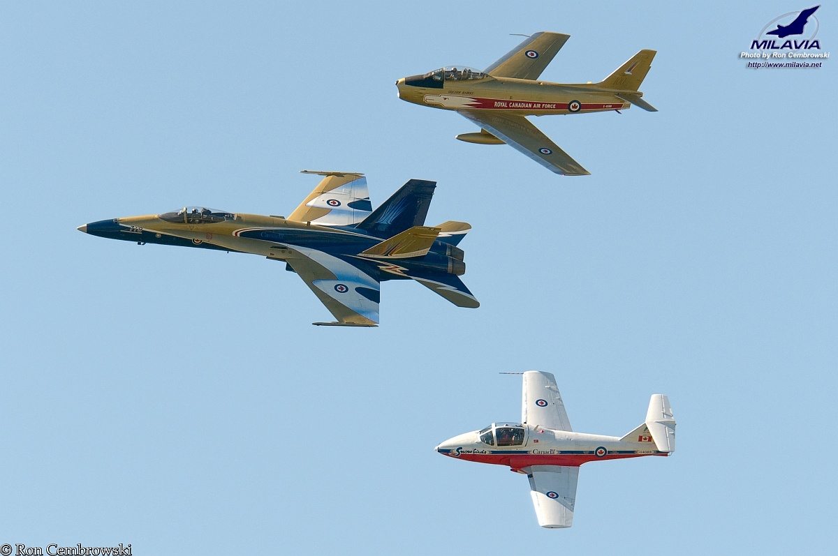 The 2009 Centennial Heritage Flight formation fly past of the Canadian Forces CF-18 Demo Hornet, the Vintage Wings of Canada F-86 Sabre "Hawk One" and Canadian Forces Snowbirds CT-114 Tutor. Photo taken at CFB Trenton.