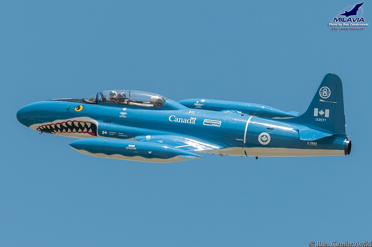 The privately owned CT-133 (C-FRGA) "Mako Shark" at the 2013 Waterloo Air Show. The aircraft is in a replica colour scheme that originally appeared on a VU-32 squadron CT-133.
