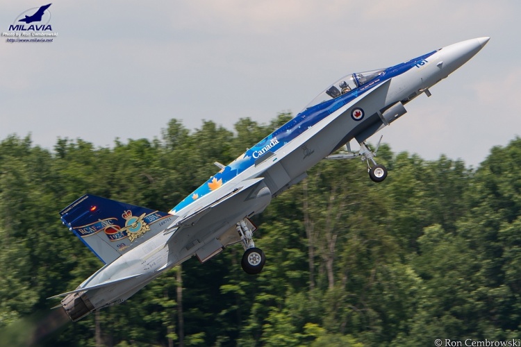 The 2014 CF-18 Demo Hornet launches at the Waterloo Air Show, piloted by Captain Adam "Manik" Runge. The 2014 Demo Hornet colours celebrate the 90th anniversary of the RCAF (1924 - 2014).