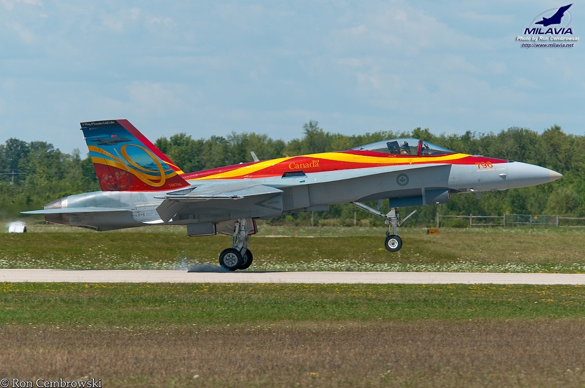 The Canadian Forces 2011 CF-18 Demo Hornet, piloted by Capt. Erick O'Connor, touches down after completing the flying demonstration at the 2011 Waterloo Air Show.
