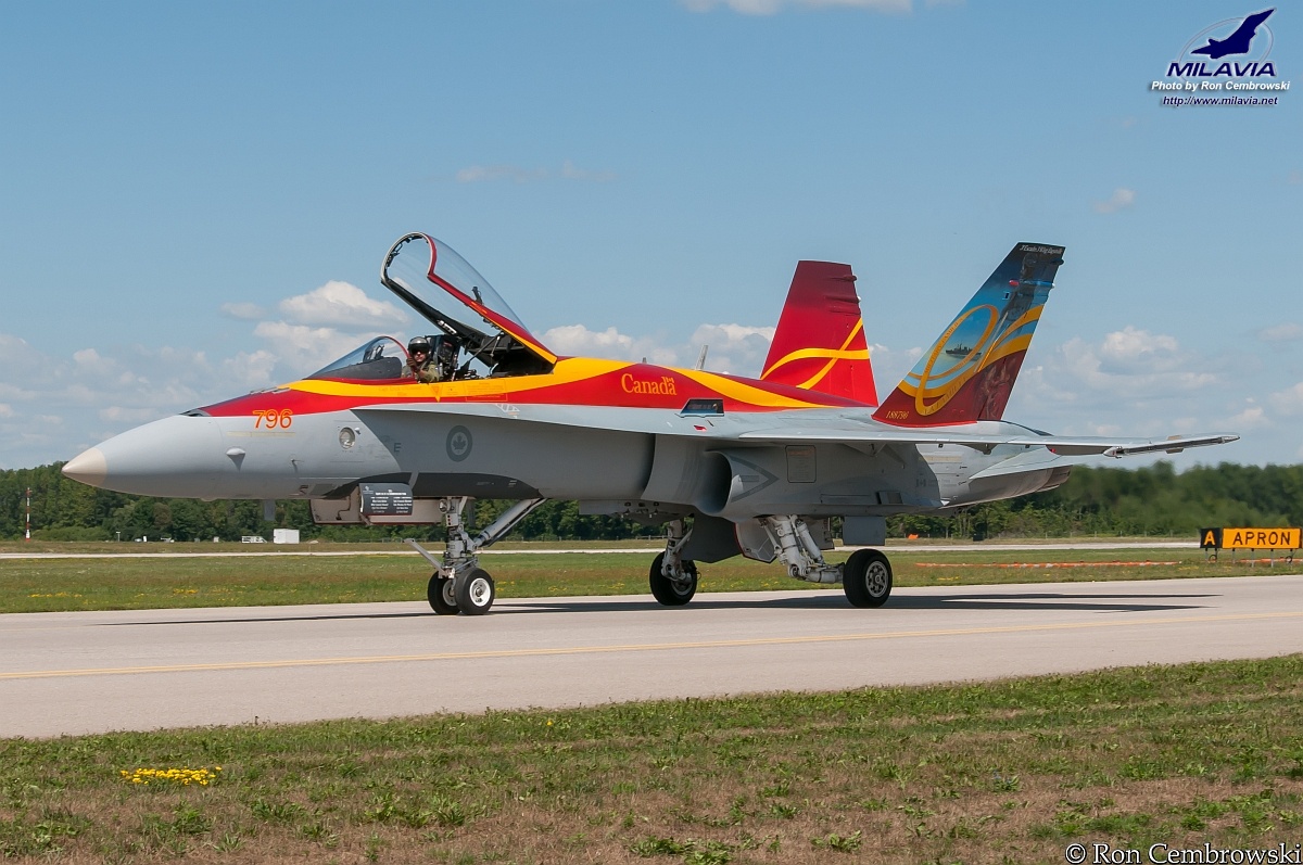 The Canadian Forces 2011 CF-18 Demo Hornet, piloted by Capt. Erick O'Connor, taxiing back to the hot ramp after completing the flying demonstration.