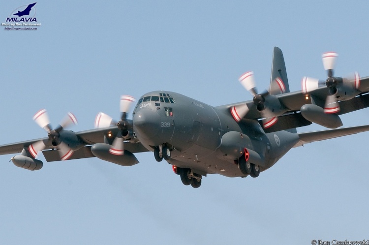 A CC-130H(T) Hercules from 435 Squadron (CFB Winnipeg, MB), on approach to Rwy 23 at Toronto-Pearson International Airport during the 2012 Canadian International Air Show. This aircraft is outfitted with air-to-air refuelling pods.