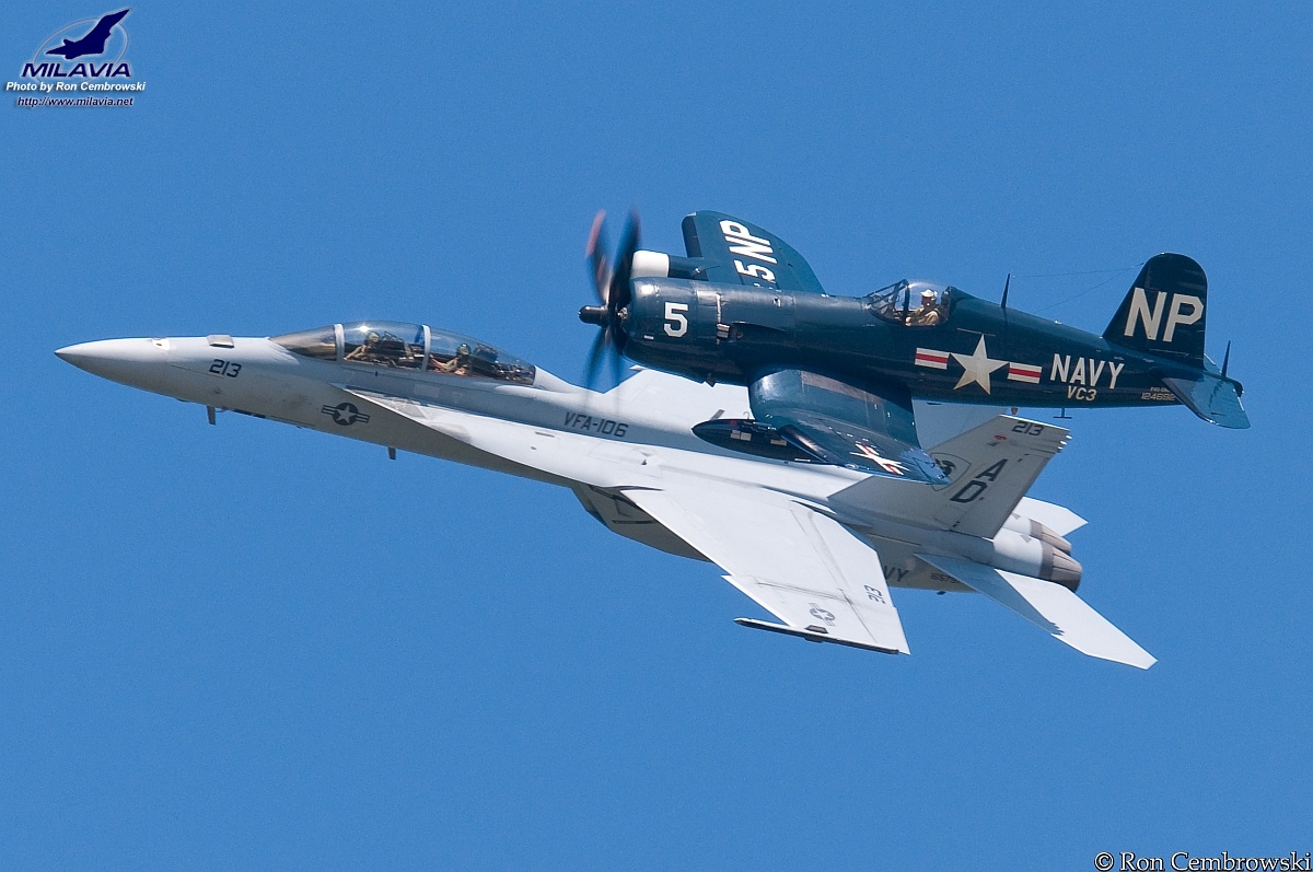 A USN Legacy Flight featuring a F4U Corsair (N45NL) and a F/A-18F Hornet (165797) at the 2008 Cleveland National Air Show (Burke Lakefront Airport (KBKL), OH).