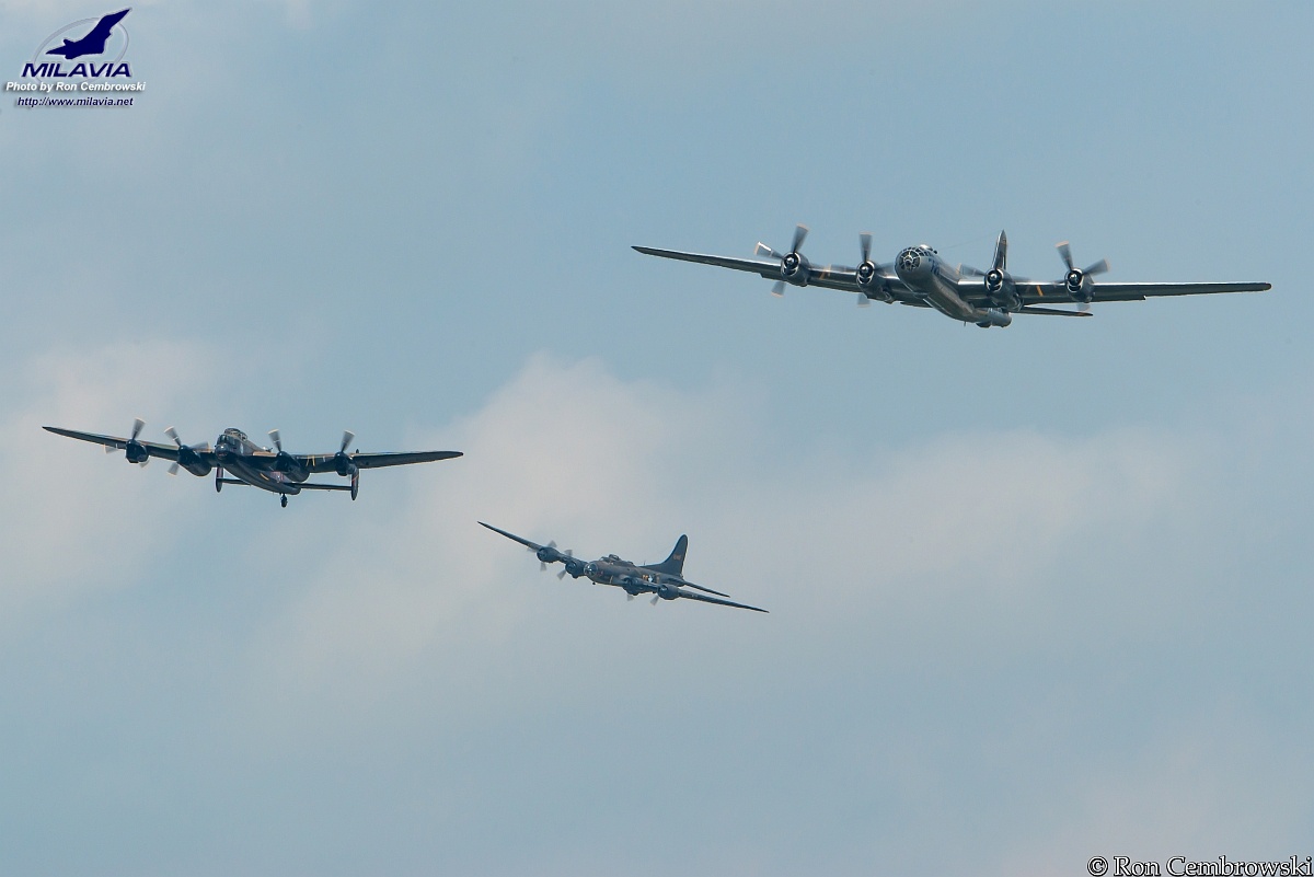 A bomber flypast with the CAF B-29 Superfortress "Fifi" in the lead, the CWH "Mynarski Memorial" Lancaster MkX and the Liberty Foundation B-17G Flying Fortress "Memphis Belle", at the 2015 Thunder Over Michigan Air Show.