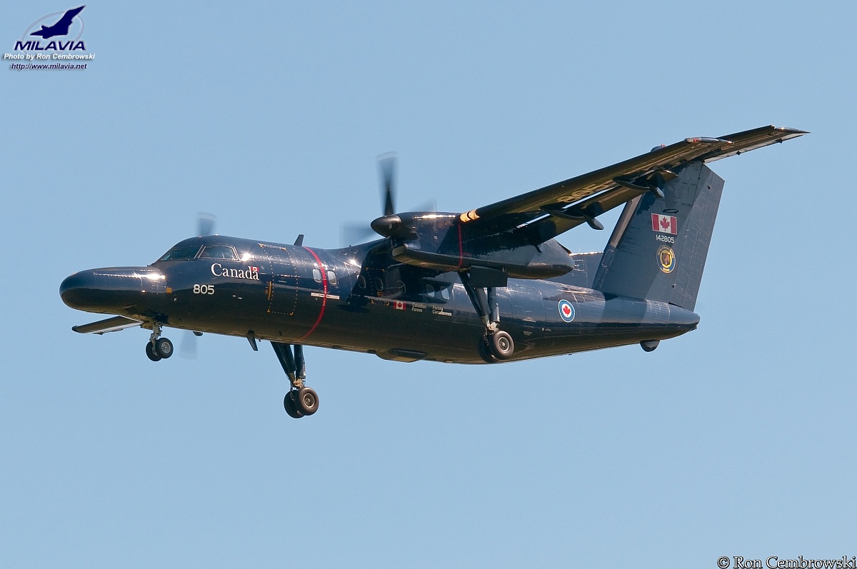 A CT-142 Dash-8 "Gonzo" (142805) from 402 Squadron based at CFB Winnipeg, photographed in 2013, on final approach to Rwy 31 at Winnipeg James Armstrong Richardson International Airport (CYWG), MB.