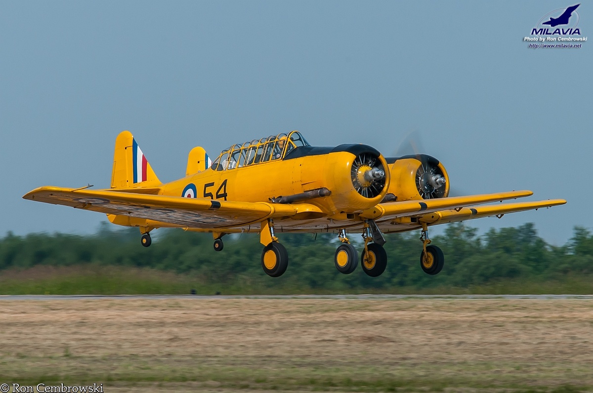 A pair of Harvards, with Harvard MkII (C-FRWN) in the lead, at the 2011 Hamilton Air Show, ON. These Harvards are operated by the Canadian Harvard Aircraft Association (Tillsonburg, ON).