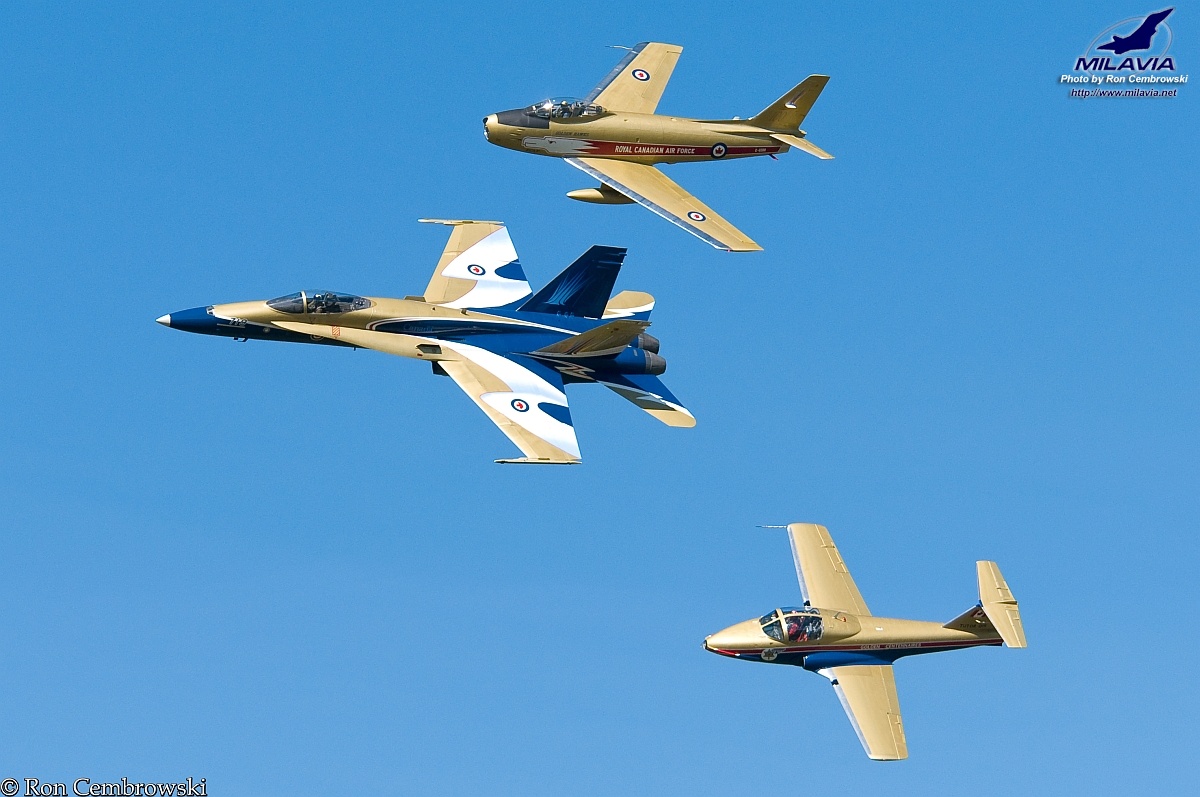 The 2009 Centennial Heritage Flight formation fly past of the Canadian Forces CF-18 Demo Hornet, the Vintage Wings of Canada F-86 Sabre "Hawk One" and Canadian Forces CT-114 Tutor "Golden Centennaires". Photo taken at Gatineau-Ottawa Executive Airport.