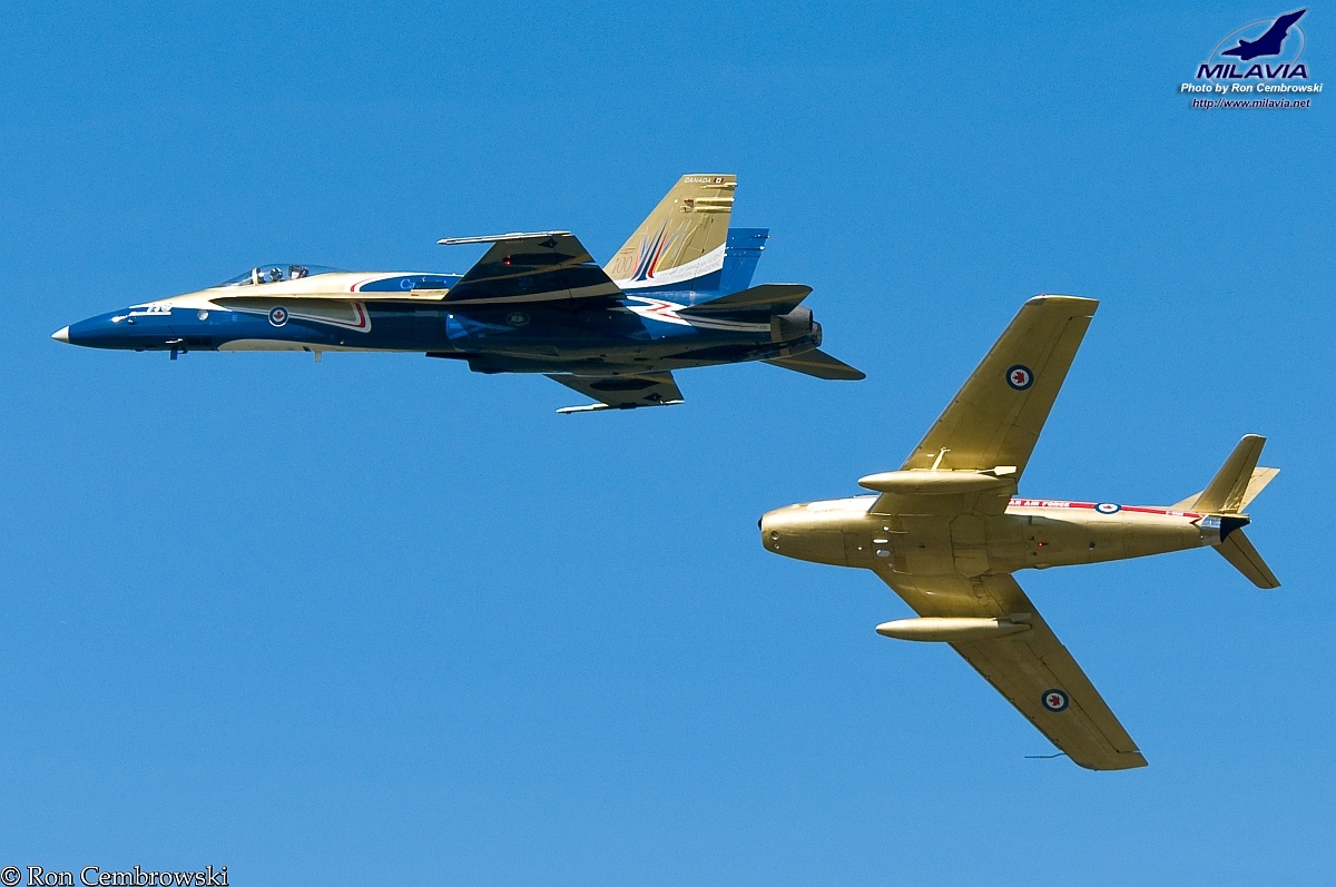 Flypast of the Canadian Forces 2009 CF-18 Demo Hornet and the Vintage Wings of Canada F-86 Sabre, breaking right. Photo taken at Gatineau-Ottawa Executive Airport.