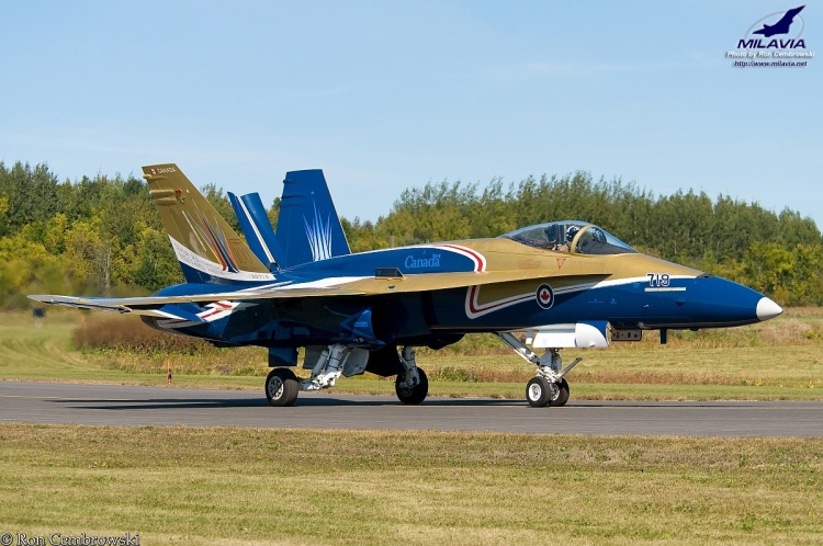 The 2009 CF-18 Demo Hornet, piloted by Captain Tim "Donor" Woods, taxiing back to the main ramp at Gatineau-Ottawa Executive Airport.