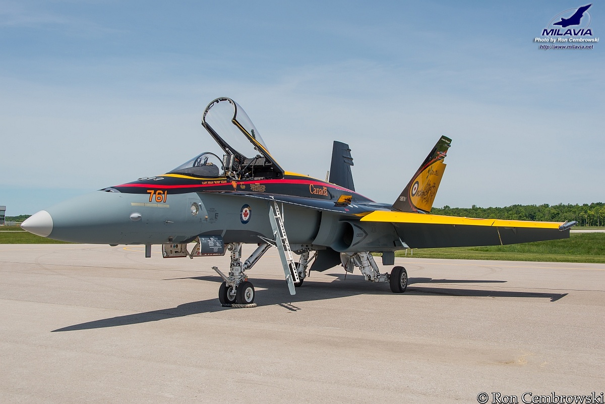 2016 RCAF CF-18 Demonstration Team Hornet in commemorative BCATP colour scheme. Photo taken at Lake Simcoe Regional Airport, Ontario.