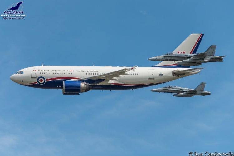 CC-150 Polaris (15001) in Government of Canada colours, flypast with two CF-188 Hornets. Photo taken at Air Show London, Ontario, September 2016.