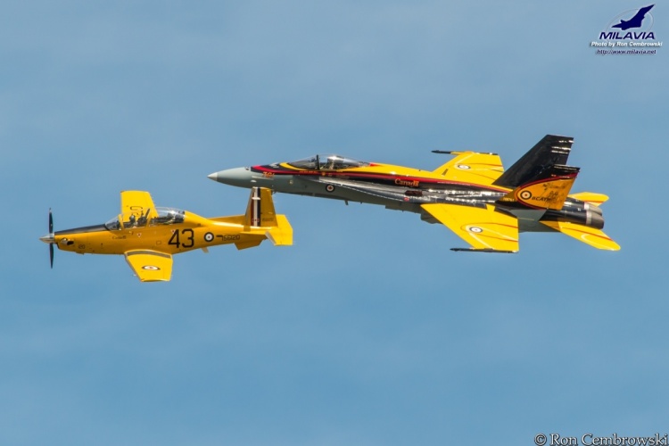 Flypast of CT-156 Harvard II (156120) and CF-18 Demo Hornet (188761) in BCATP commemorative colours. Photo taken at Air Show London, Ontario, September 2016.