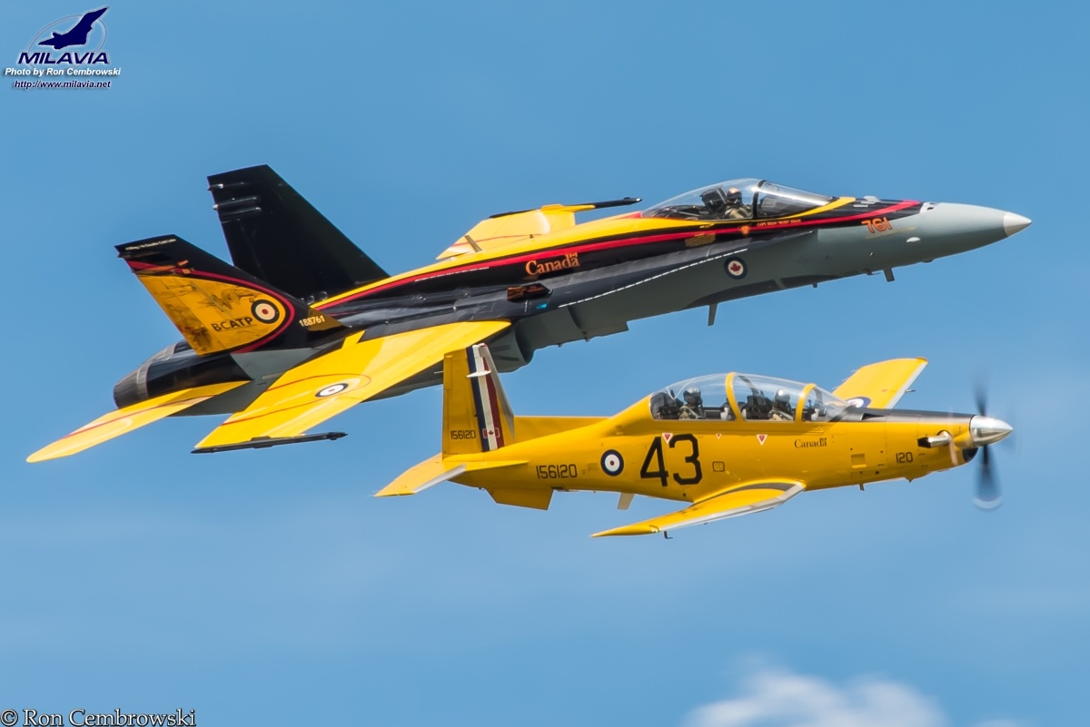 Flypast of CT-156 Harvard II (156120) and CF-18 Demo Hornet (188761) in BCATP commemorative colours. Photo taken at Air Show London, Ontario, September 2016.