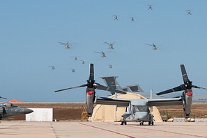 The U.S. armed forces, which have a major presence at Naval Station Rota, took part in the static display with a US Marine Corps MV-22B Osprey of VMM-261 'Moonlight' and a single AV-8B+ Harrier II belonging to VMA-223 'Bulldogs'. Both flew in from Morón de la Frontera (the Osprey is stationed at Morón Air Base, the Harrier was there on a temporary deployment).