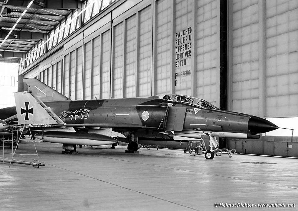 37+15 in a hangar at Manching early in its career in March 1975, 37+15 was the first F-4F of ErprSt 61/WTD 61 and solely operated by the test unit for its entire service life until final retirement in 2013.