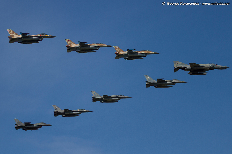 Hellenic Air Force F-4E-AUP Phantom II leading the F-16 formation. Photo copyright George Karavantos
