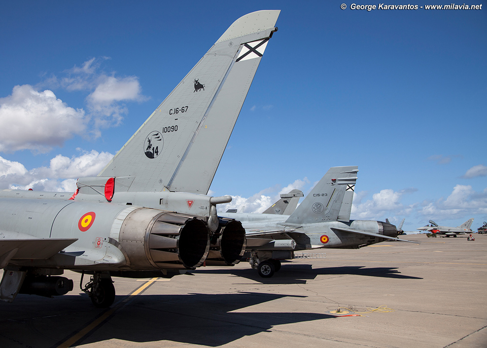 The Eurofighter Typhoon is designated C.16 in Spanish service, while the Hornet is C.15. Photo copyright George Karavantos