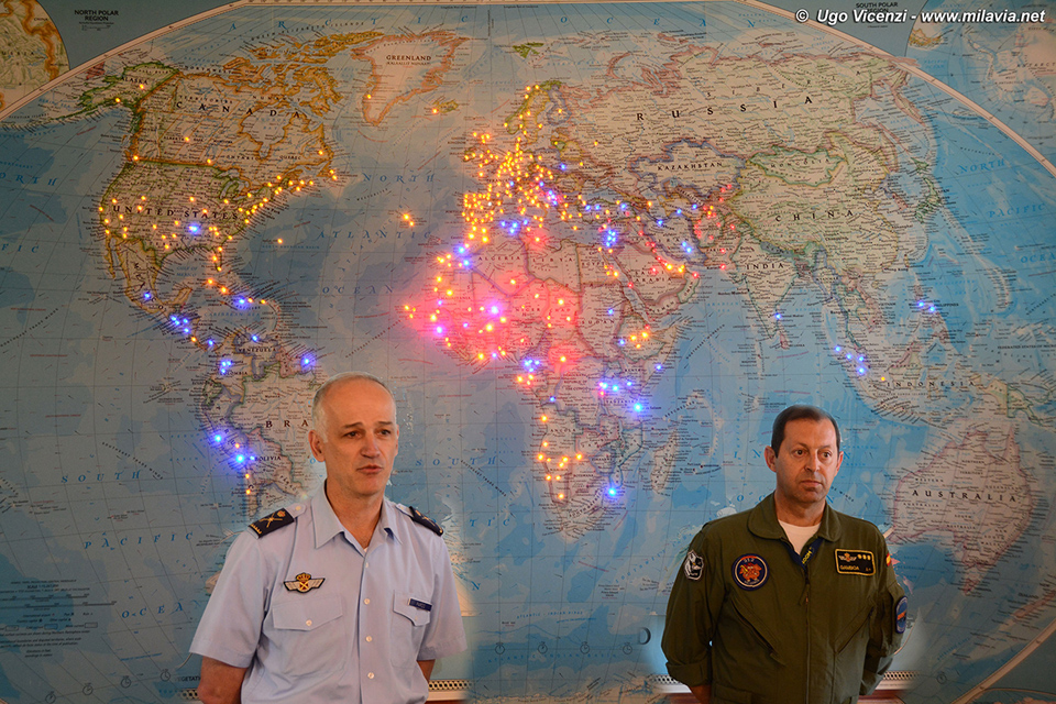 Brig. General José Luis Pardo and Colonel Andrés Gamboa show the operational theatres, humanitarian missions, and other transport missions of Ala 31. Photo copyright Ugo Vicenzi