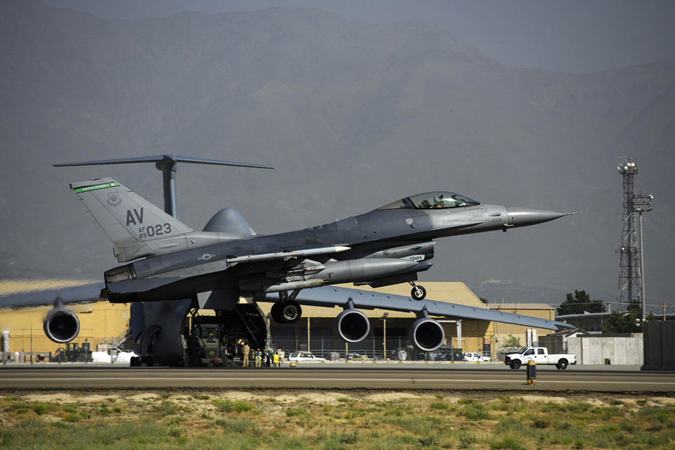 An 555th EFS F-16, piloted by Brig. Gen. Jim Sears, takes off from Bagram Airfield, Afghanistan, May 22, 2017. Sears served as the commander of the 455th Air Expeditionary Wing for the previous 12 months and soon departed Afghanistan to continue his Air Force career. (U.S. Air Force photo by Staff Sgt. Benjamin Gonsier).